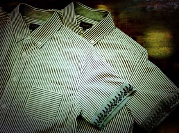 袖口に民族調の刺繍を施すことによってシンプルな中にもデザインの光るアイテムに仕上がっています。ストライプ生地が季節感を演出します。左肩バックにロゴ刺繍あり。